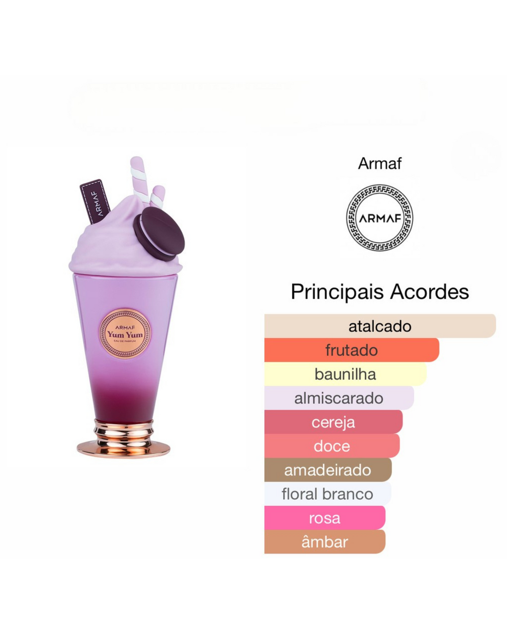 Inspirada na sensação de um milkshake tropical, Yum Yum combina notas frutadas vibrantes, flores suaves e uma base gourmand, criando um aroma fresco, doce e envolvente. Ideal para uso diário, encontros casuais ou ocasiões especiais, este perfume reflete o luxo acessível da Armaf, apresentado em um frasco kitsch e colorido que evoca diversão e nostalgia.